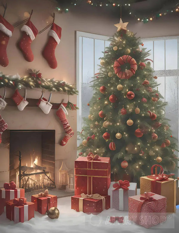 Christmas tree with some presents and a fireplace