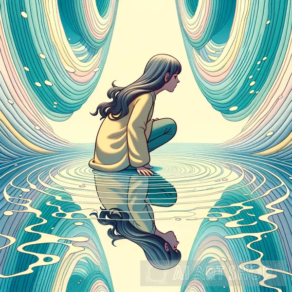 Delve into the depths of self-reflection with this illustration of a young woman looking at her reflection in a pond, seeing multiple versions of herself. A poignant representation of identity, growth, and introspection.