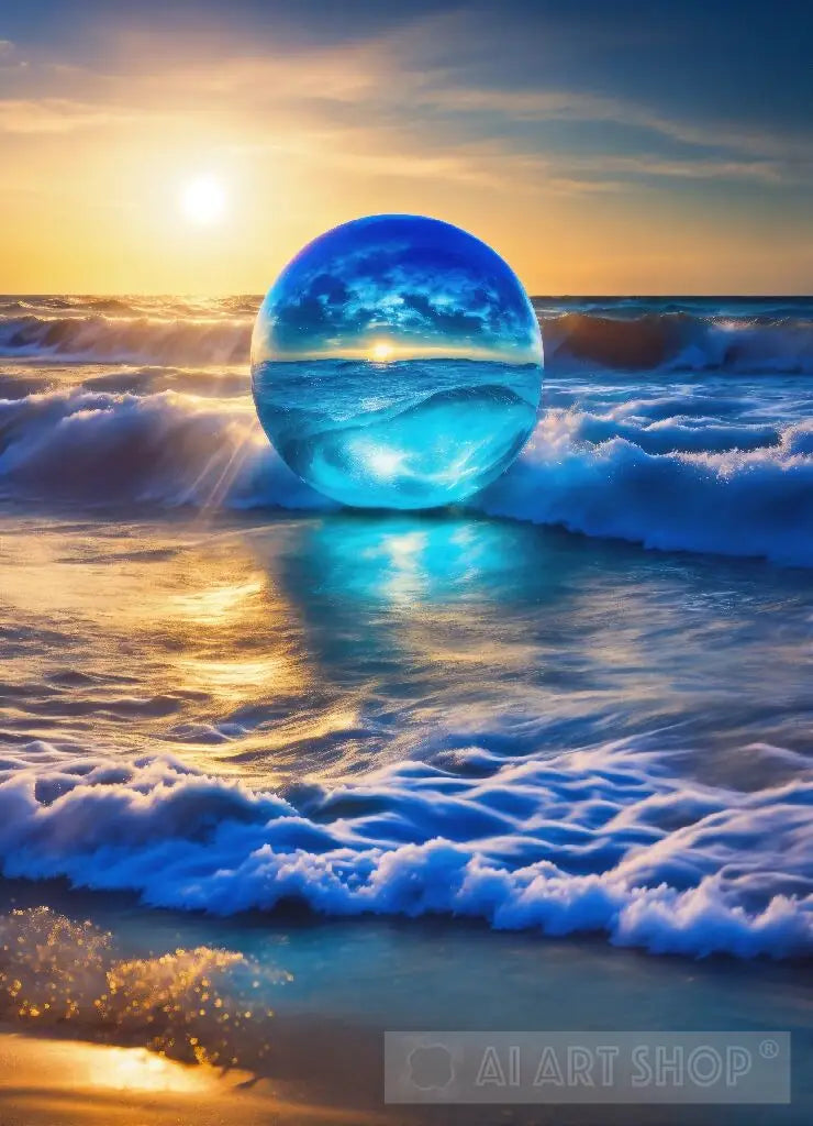 Blue energy ball, Archangel Michael sits on the beach and looks at the sea of waves. All you can see is his back, sunshine, bliss