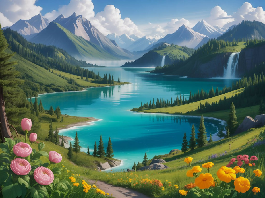 This breathtaking landscape artwork captures the pure beauty of nature, featuring a crystal-clear turquoise lake surrounded by majestic alpine mountains, lush green forests, and vibrant wildflowers in full bloom,
