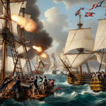 18th Century Naval Battle: A fierce naval battle with tall ships firing cannons at each other amidst crashing waves. Sailors are seen climbing rigging, manning cannons, and engaging in hand-to-hand combat on the decks. The sky is filled with smoke and the scene is dynamic and action-packed.
