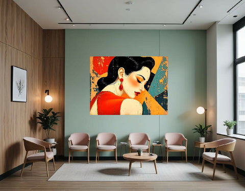 The painting presents a vintage-inspired portrait of a woman with a striking retro aesthetic. She has fair skin, dark, wavy hair, and wears a red dress with gold trim, adding a touch of glamour. Her makeup is dramatic, featuring red lipstick and heavy eyeshadow in shades of gold and orange. She also wears a pair of red teardrop earrings with a rose-shaped stud. Her gaze is downward and to the right, exuding an air of elegance and sophistication.