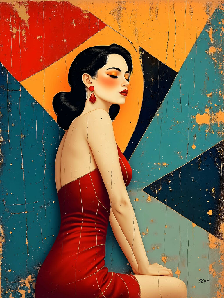 The background is divided into geometric shapes, primarily triangles, in a color palette of red, orange, and teal. The background also features a distressed texture, with splatters and cracks that lend a vintage, weathered feel. Thin gold-colored lines are also visible. Overall, the painting has a retro vibe, combining classic glamour with a distressed, urban sensibility.