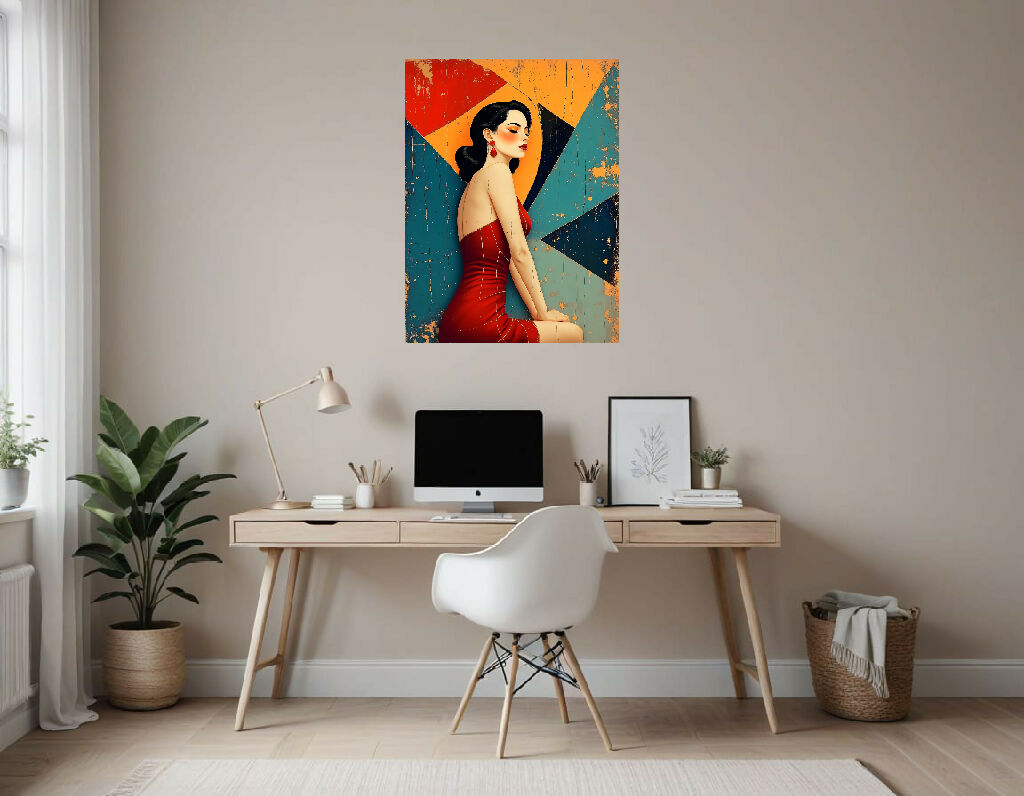 The painting is a stylized portrait of a woman with a vintage aesthetic, posed in front of a geometric background.