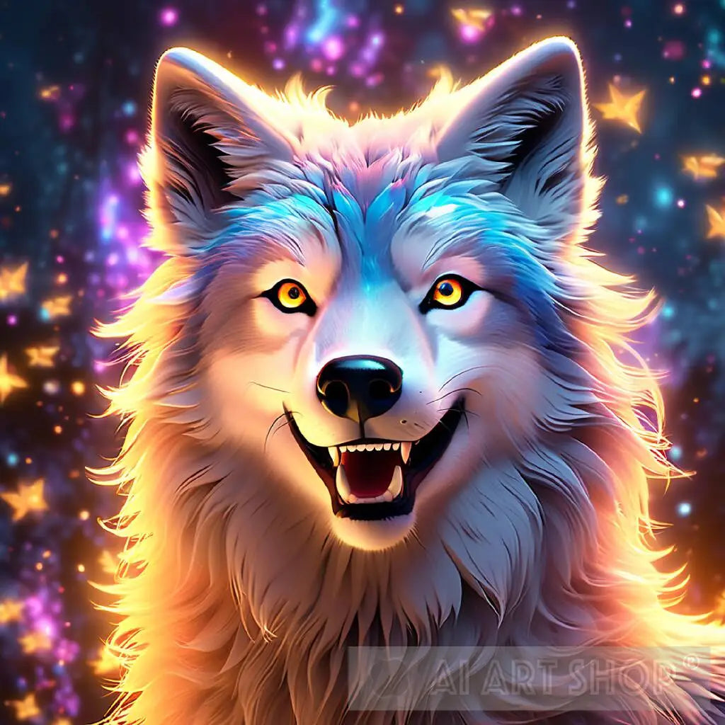 Explore a stunning 3D wolf emoji painting set against a magical night sky with a mystical background