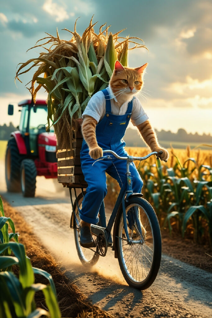 4. Biking Home Wearing the same blue overalls, the orange tabby cat rides the overloaded bicycle along a bumpy farm road, corn piled high in the back. His red tractor fades into the background. His eyes are focused on the path home, wind ruffling his fur, with warm light spilling across the rural landscape.