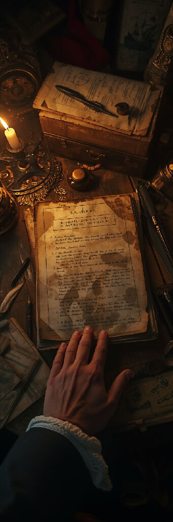 A 1700s wooden desk lit by candlelight inside a naval office. Maps, quills, and ink pots scatter the surface. In the center, a stack of weathered reports lies open — handwritten accounts describing a ghostly ship seen at sea. One parchment reads: “A vessel glowing red in the storm… vanished into mist.” An officer’s hand hovers above the documents, as if deciding whether to believe these strange reports. Photorealistic, cinematic, eerie atmosphere.