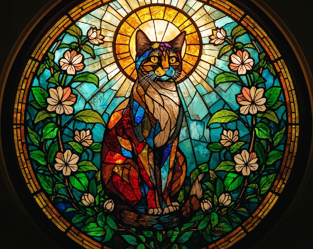 A beautiful and vibrant stained glass artwork featuring a graceful, colorful cat sitting elegantly in the center of the frame, surrounded by lush emerald leaves and blooming white and pink flowers. The composition is perfectly symmetrical within a circular stained glass window design. The background glows with radiant blue, turquoise, and golden glass pieces, with sunlight streaming through like a divine halo. The cat’s fur shimmers with multicolored stained glass fragments—amber, sapphire, and ruby tones—its golden eyes full of gentle wisdom. Highly detailed, luminous reflections, glowing glass textures, fantasy cathedral lighting, ethereal atmosphere, ultra-realistic