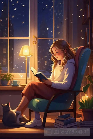 a beautiful girl is reading an interesting book in a cozy chair:: there is a cat nearby:: it is snowing outside the window:: evening lighting from a lamp:: deep focus: illustration for a story about a girl