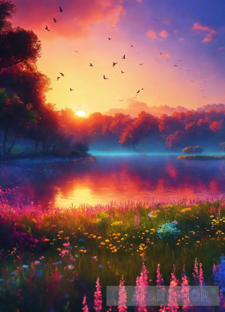 A beautiful grassy meadow, at sunset, birds, lake, psychedelic colorful, highly detailed, dream-like, colorful light, bright, vibrant colors, diffused light, photorealistic, volumetric lighting, 4K