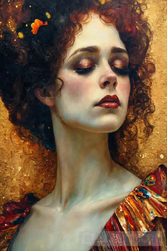 Digital art painting of a beautiful young woman with curly copper hair in an updo. She is wearing a low white blouse. Detailed feminine face looking at the camera.