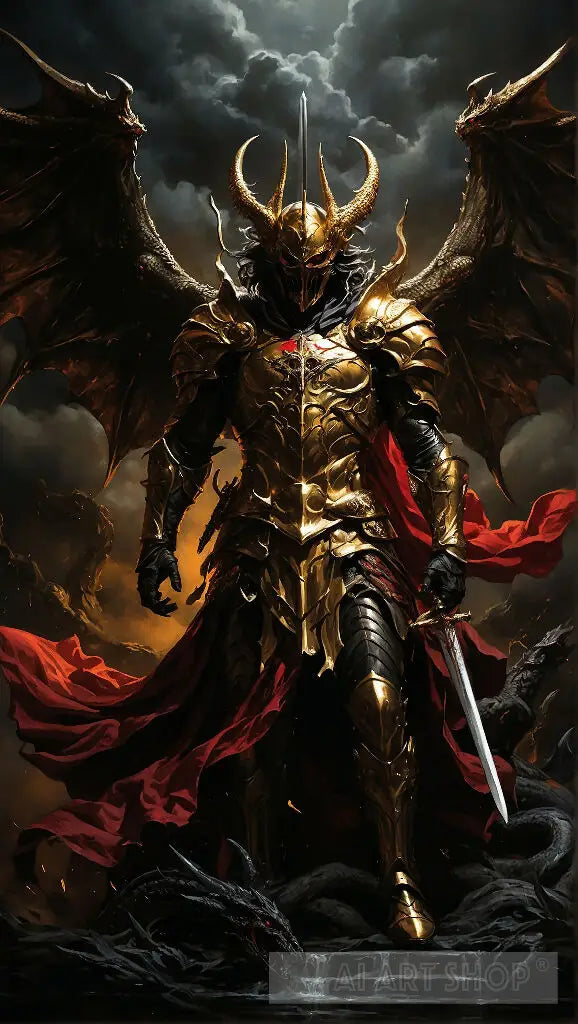 A beautifully drawn (((comic book illustration))) in the style of Scott Campbell featuring his iconic Saint Michael, a knight in flowing golden armor with a red cape and sword battling a malevolent demon on the back of a fearsome black dragon, set against a luxurious (golden) backdrop designed by Dan Mumford