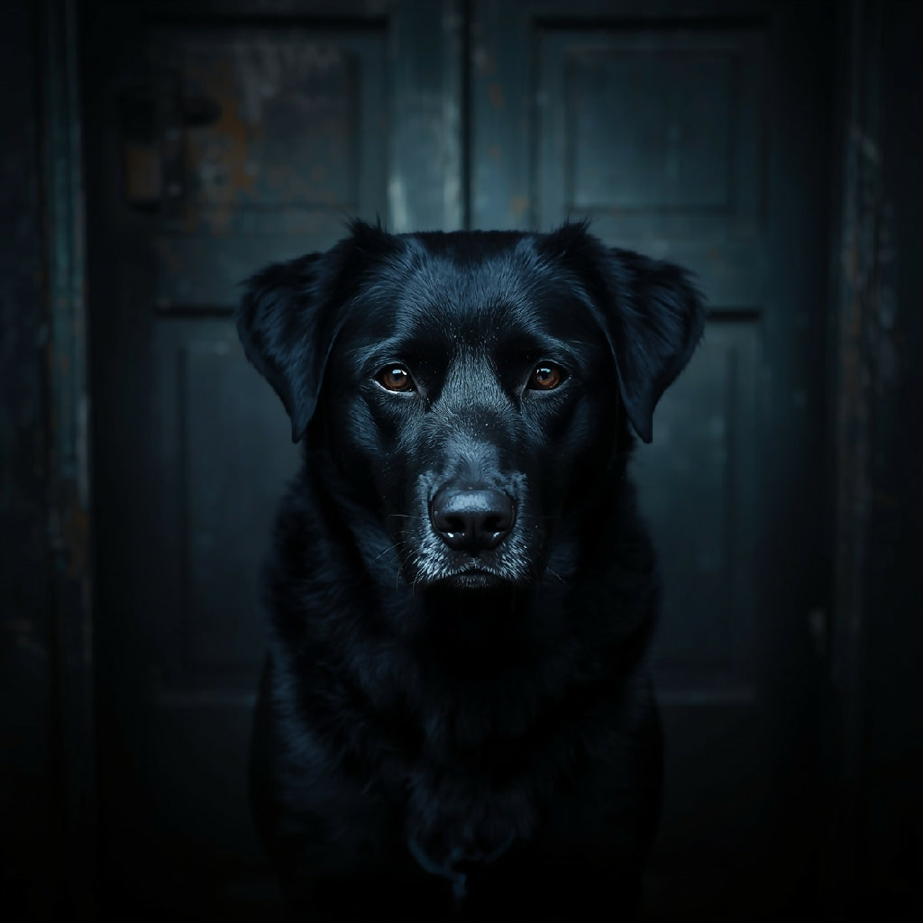 A black dog with completely black eyes stands at a worn wooden back door, surrounded by an aura of mystique, its fur a deep, glossy black, with an air of intrigue, the door's old hardware and worn paintwork visible, as the dog's eyes seem to hold a deep, unblinking gaze, set against a subtle, gradient background that shifts from a deep blue to an inky black, evoking a sense of mystery and otherworldliness, with the dog's facial features, including its nose and mouth, subtly illuminated, as if by an unseen moonlight, and its overall demeanor conveying a sense of quiet, mystical power.