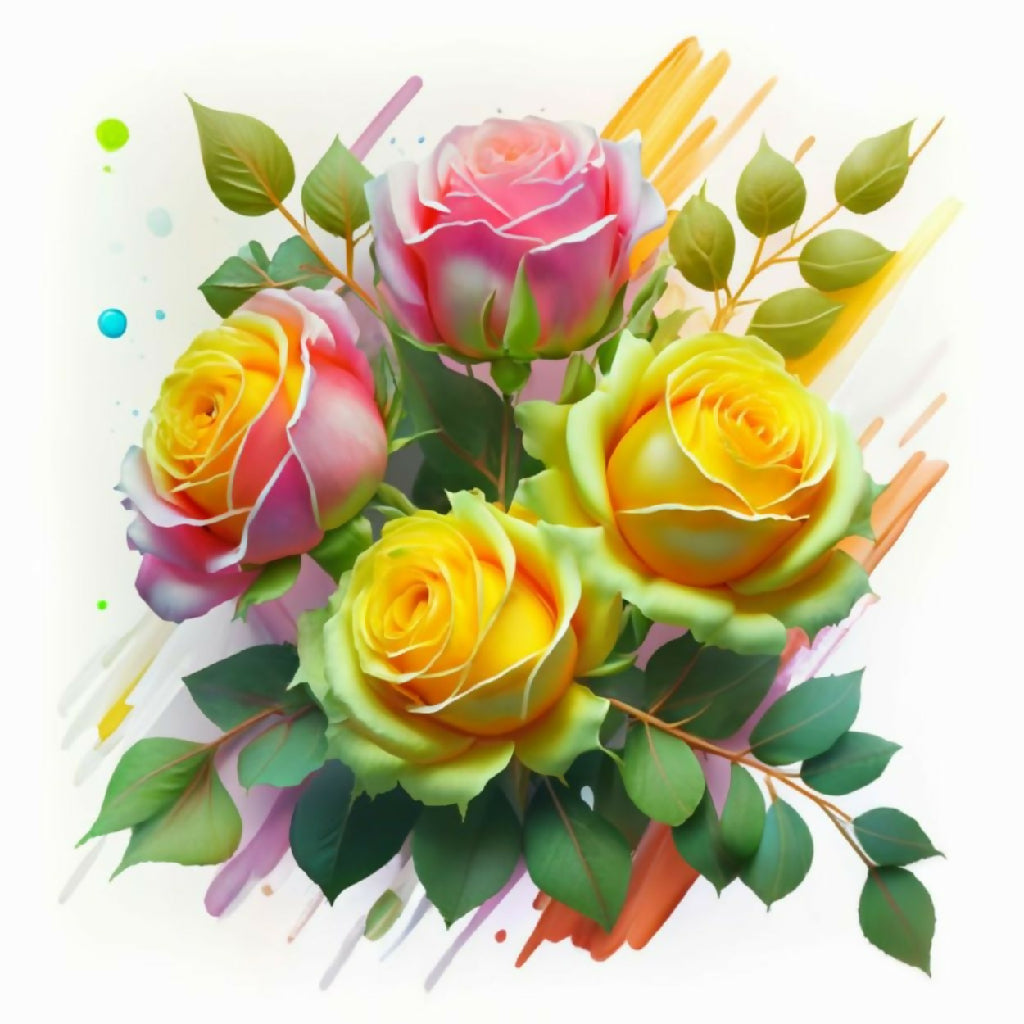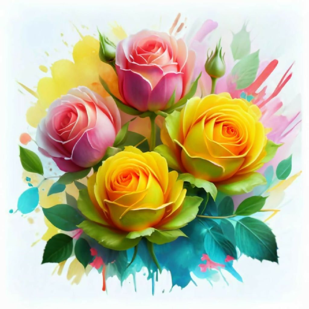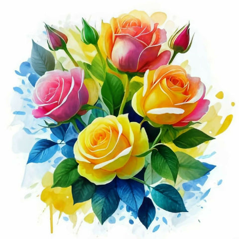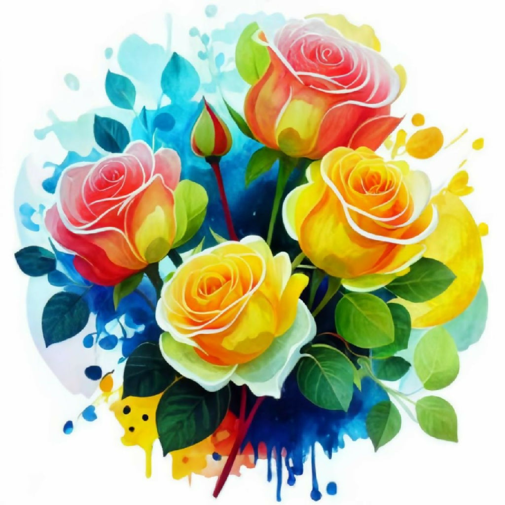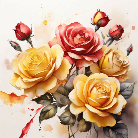 A beautifully painted watercolor floral arrangement featuring a lush bouquet of roses in warm, vibrant hues. The composition includes fully bloomed red, orange, and yellow roses, along with delicate rose buds and small white daisies. Green leaves and stems add natural contrast, while artistic splashes and drips of paint enhance the dynamic, expressive style. The background is softly blended with subtle gradients of yellow, blue, and red, creating a dreamy, romantic atmosphere. This artwork exudes elegance and emotion, perfect for decorative or inspirational purposes.