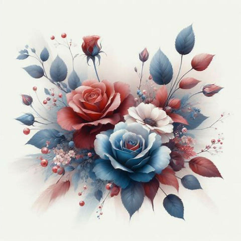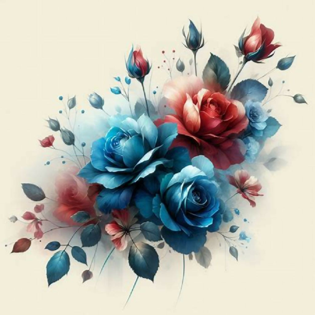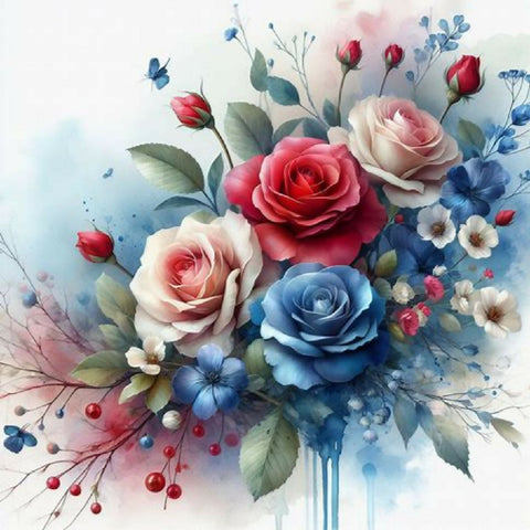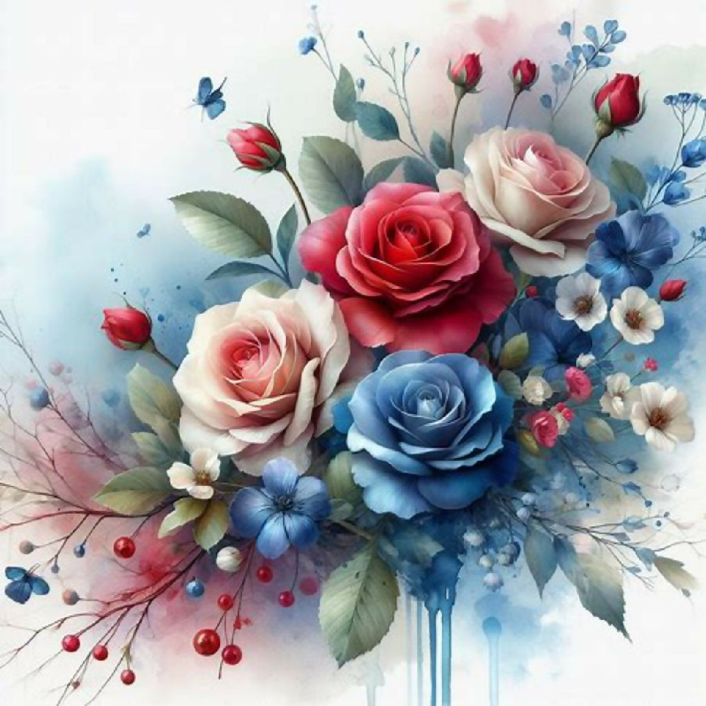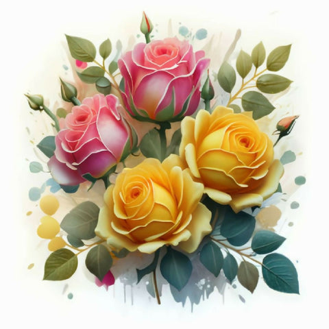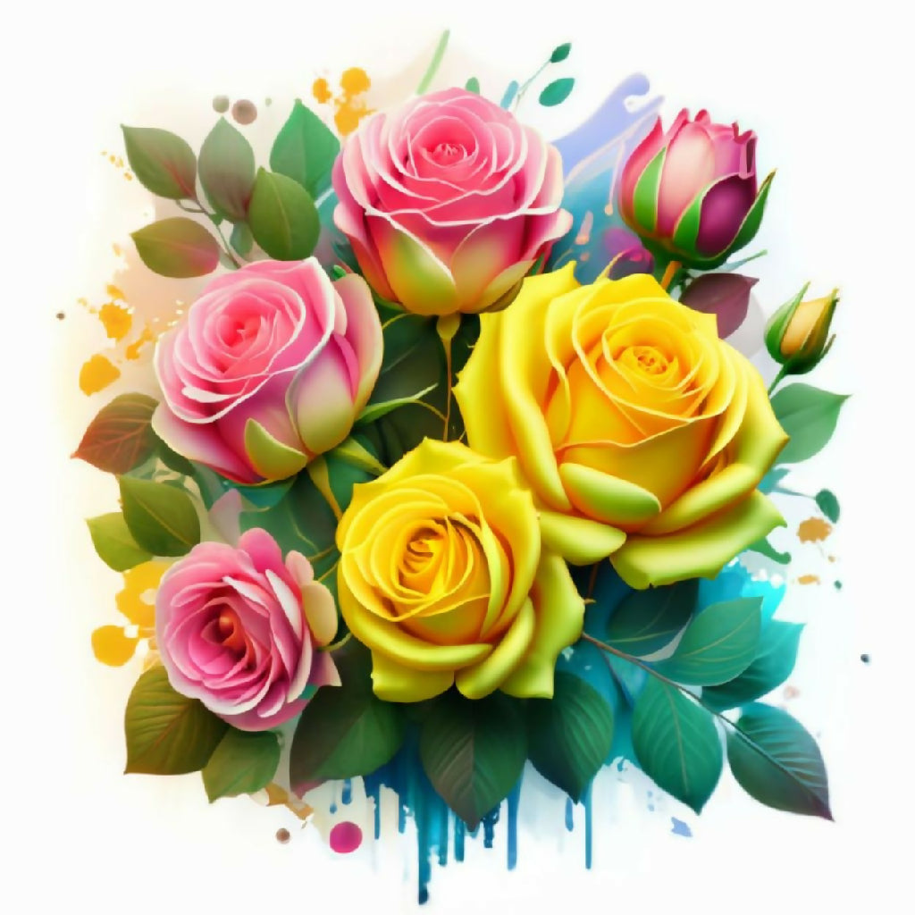 A beautifully painted watercolor floral arrangement featuring a lush bouquet of roses in warm, vibrant hues. The composition includes fully bloomed red, orange, and yellow roses, along with delicate rose buds and small white daisies. Green leaves and stems add natural contrast, while artistic splashes and drips of paint enhance the dynamic, expressive style. The background is softly blended with subtle gradients of yellow, blue, and red, creating a dreamy, romantic atmosphere. This artwork exudes elegance and emotion, perfect for decorative or inspirational purposes.