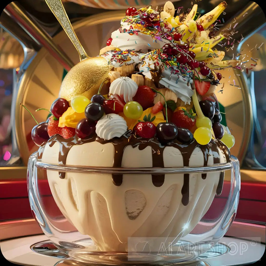 A stunning high-definition image of a massive, golden-topped ice cream sundae overflowing with a delightful medley of cherries, grapes, strawberries, bananas, and pineapple. The ice cream sundae is encased in a clear glass container, and as it captures the viewer's attention, the gold-plated spoon appears to be sparkling. An explosion of colorful toppings, including sprinkles, chocolate syrup, and whipped cream, adorns the top of the sundae. The background has a vibrant, festive atmosphere