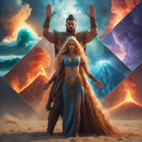 A breathtaking 3D render, bursting with vibrant colors and dynamic energy, depicting a fantastical scene divided into five diagonal sections, each showcasing a catastrophic event: a towering tsunami, a raging sandstorm, a deluge of biblical proportions, a fiery inferno sparked by torrential rain, and a blizzard of epic proportions. At the center, a mesmerizing, striking couple stands victorious, their figures radiating confidence and ancient mystique. The man, with his dark-blond undercut and beard, stands tall, supported by his ravishing, blonde-haired partner, her locks cascading down her back in luscious, golden waves. Together, they wield magical powers, harnessing the forces of nature, their ancient, ornate battle attire shimmering with an air of mysticism. As they raise their hands, the elements obey, sand, water, and fire swirling around them in a kaleidoscope of colors, their magic illuminating the apocalyptic landscape.