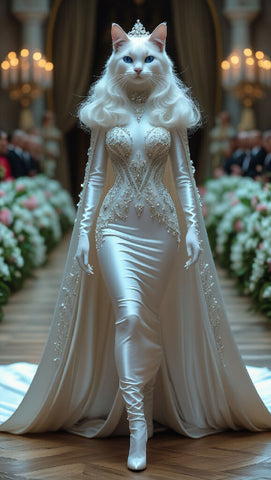 A breathtaking human-form white cat with vivid blue eyes and long, fluttering eyelashes. Her very long, silky, wavy white hair cascades in soft, luxurious waves down her back. She is dressed in a majestic couture gown fit for royalty, featuring a sleek, form-fitting silhouette that highlights her elegant figure. A daring thigh-high slit adds a touch of modern sophistication and allure. The bodice is intricately adorned with delicate, floral-inspired embroidery and shimmering beadwork, creating a rich, textured, luxurious effect. Draped from her shoulders is a grand, flowing cape, lavishly embellished with matching intricate details, adding dramatic volume and a regal, commanding presence. The gown is crafted from sumptuous satin or silk, exuding a luminous, ethereal glow with every movement. She pairs the look with elegant white stilettos. The background is a magnificent aisle lined with lush, abundant flowers inside a grand, opulent castle. The cat walks forward gracefully, radiating majestic beauty, power, and timeless grace.