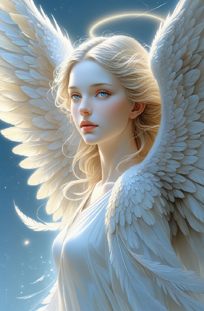 a breathtakingly detailed, high-contrast illustration of an ethereal angel, rendered in exquisite ultra-high resolution, with fine lines, delicate textures, and subtle gradations of soft, luminous color, set against a subtle, gradient blue background that evokes a sense of heavenly atmosphere, with the angel's intricate wings spread wide, their feathers a mesmerizing dance of whites, creams, and pale blues, their face a model of serene, majestic beauty, with high cheekbones, full lips, and piercing, celestial blue eyes that seem to shine with an inner light, surrounded by a subtle, shimmering aura that hints at their divine essence.