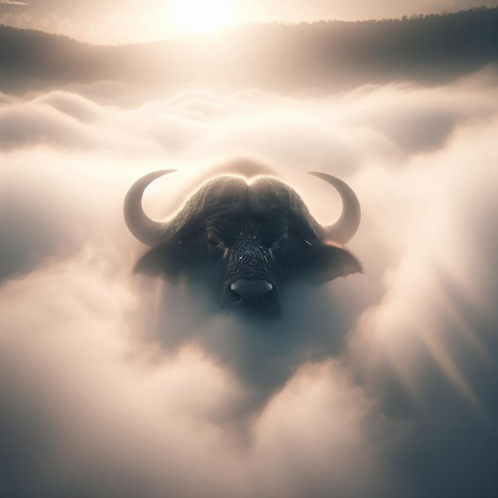 Emerging from the mist, a powerful buffalo steps into view — a majestic force of nature wrapped in mystery. This atmospheric AI-generated artwork captures the spirit of the wild, blending raw strength with ethereal calm in a dreamlike foggy landscape.