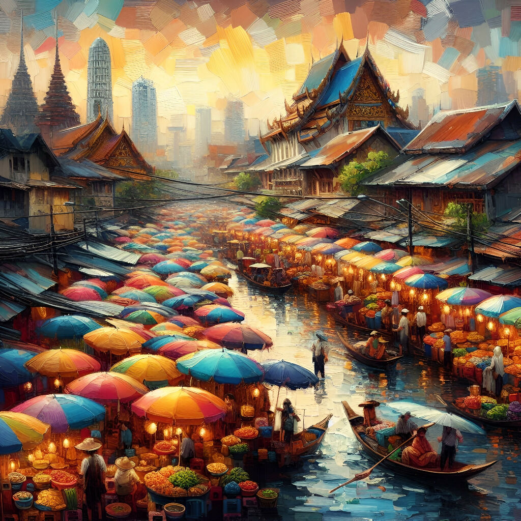 An oil painting showing the busy Damnoen Saduak Floating Market in Ratchaburi. Damnoen Saduak Floating Market consists of a maze of narrow khlongs (canals). Female traders, often wearing traditional mo hom apparel (blue farmers' shirts) with wide-brimmed straw hats (ngob) use sampans (small wooden boats) to sell their wares, often produce.These boats are often full of vegetables and colorful fruits that are photogenic.