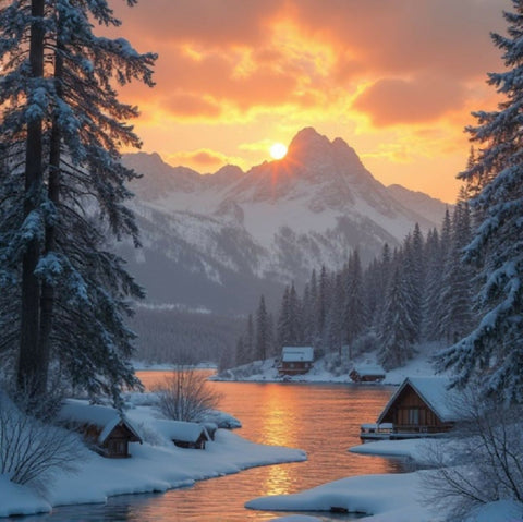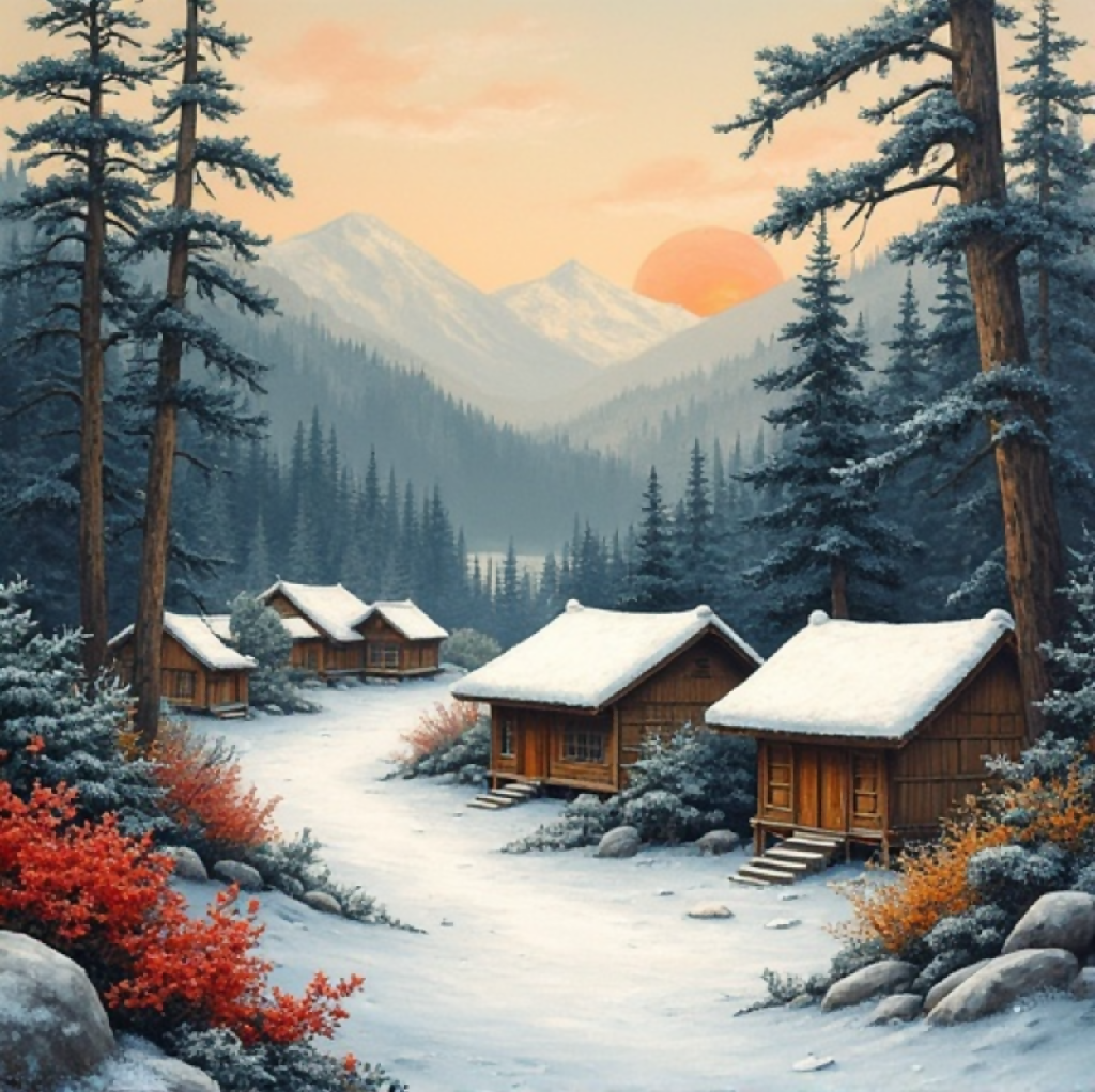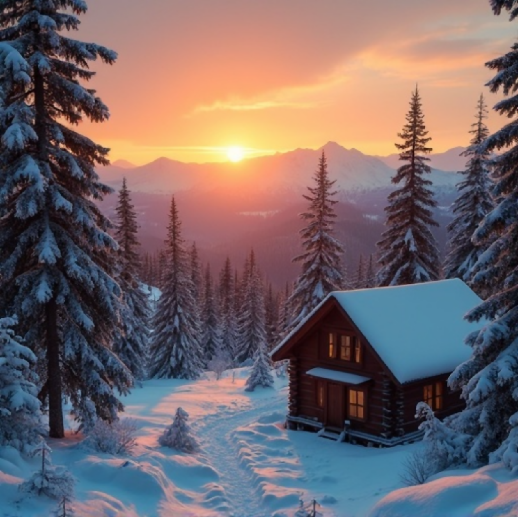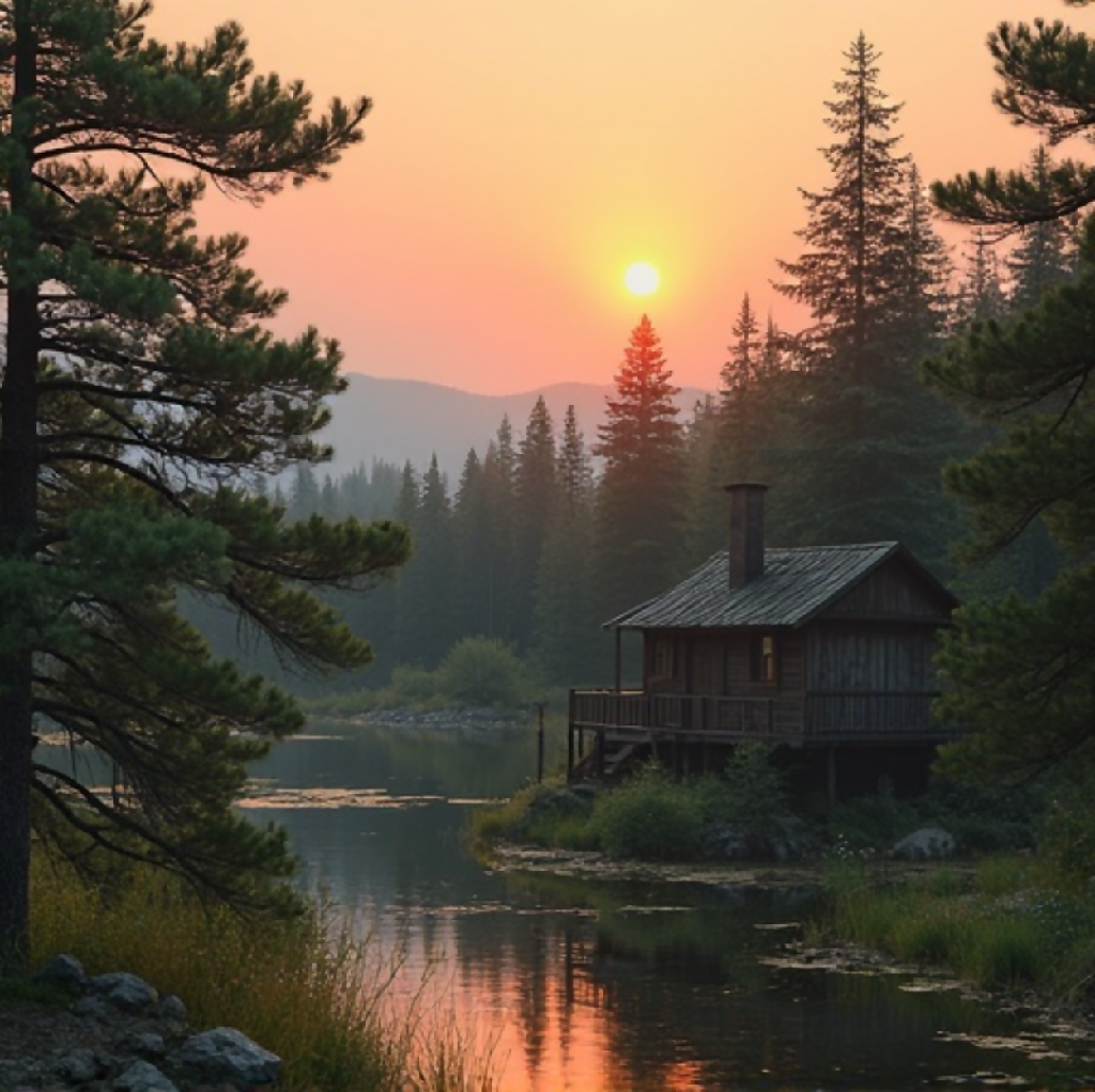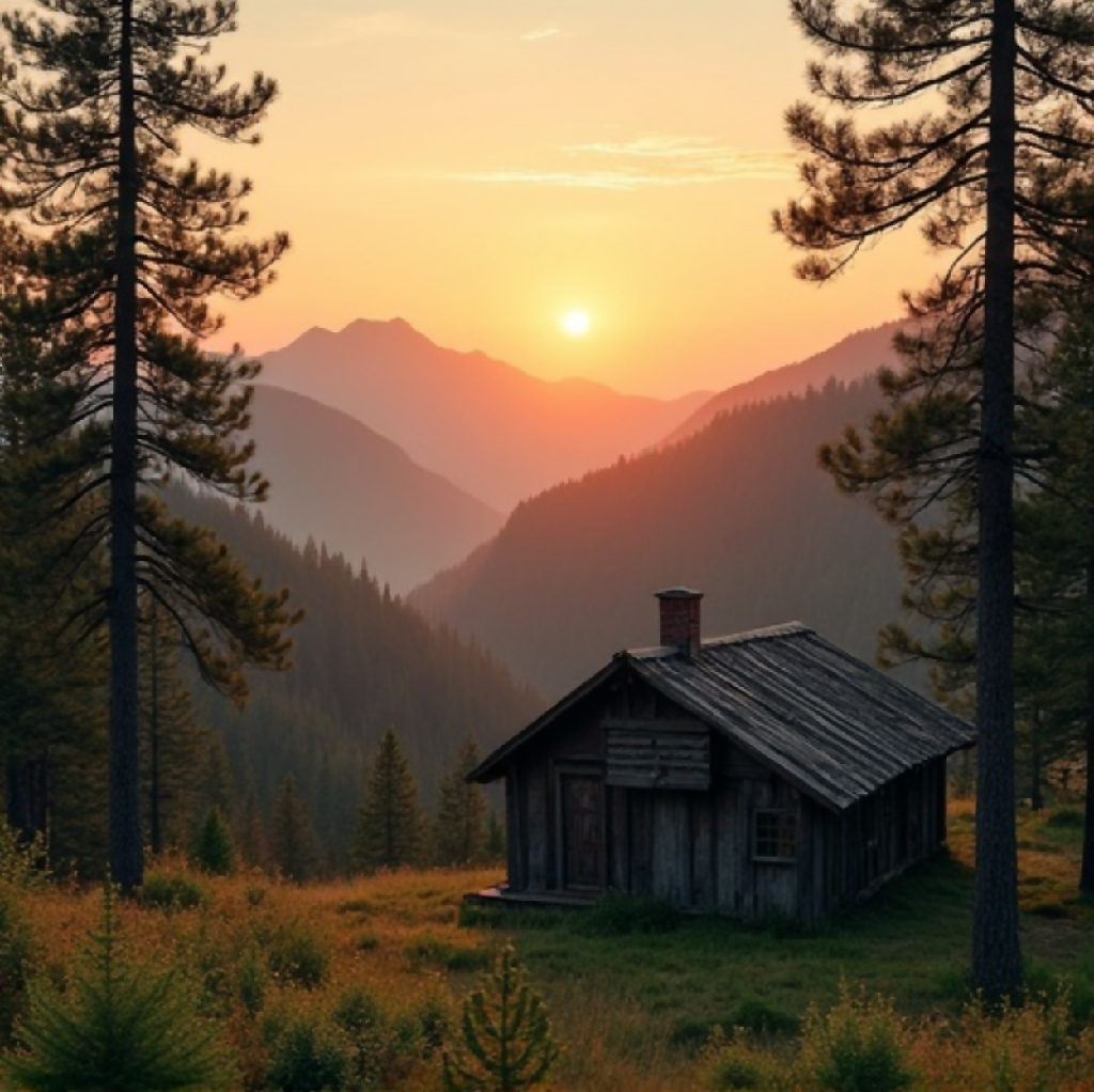 A serene and picturesque scene featuring a rustic wooden cabin nestled in a lush, forested valley. The cabin, with its weathered wood and small chimney, sits peacefully amidst tall pine trees and vibrant wildflowers. In the background, majestic mountains rise under a stunning sunset sky, painted in warm hues of orange, pink, and yellow as the sun dips below the horizon. The overall atmosphere is tranquil and inviting, evoking a sense of solitude and connection with nature.