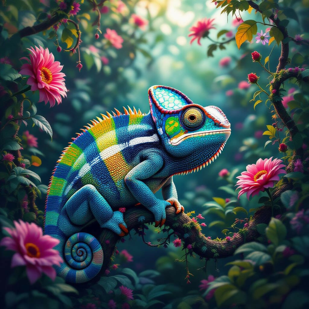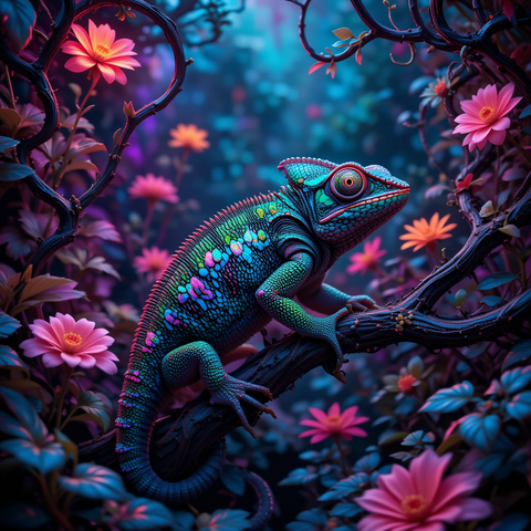 A chameleon camouflaged in a psychedelic garden of twisting vines and neon flowers