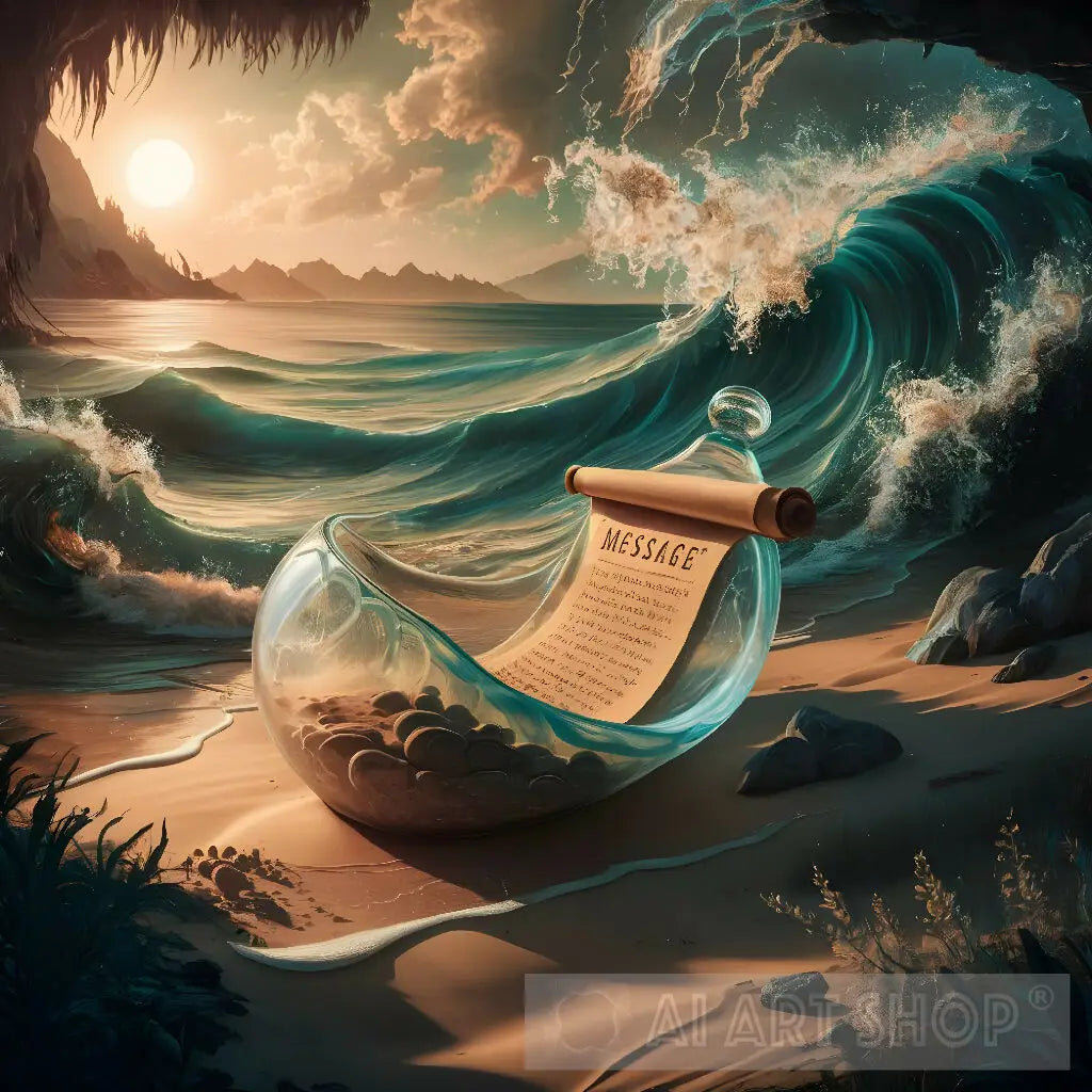 A captivating 3D rendering of a dreamlike beach scene where the sun casts a warm, golden glow on the tranquil waters and golden sands. A translucent glass vessel, half-buried in the sand, holds an ancient scroll inscribed with the mysterious word "MESSAGE". Ethereal waves ripple, their whispers carrying secrets to the shore. The intricate blend of light and shadow creates an illusion that merges reality with fantasy, inviting explorers to delve into the enigmatic landscape. This surreal masterpiece can be captured through illustration, photography, or 3D rendering, taking the viewer on a journey beyond the ordinary and into the realm of dreams. 3D render, photo, illustration, typography