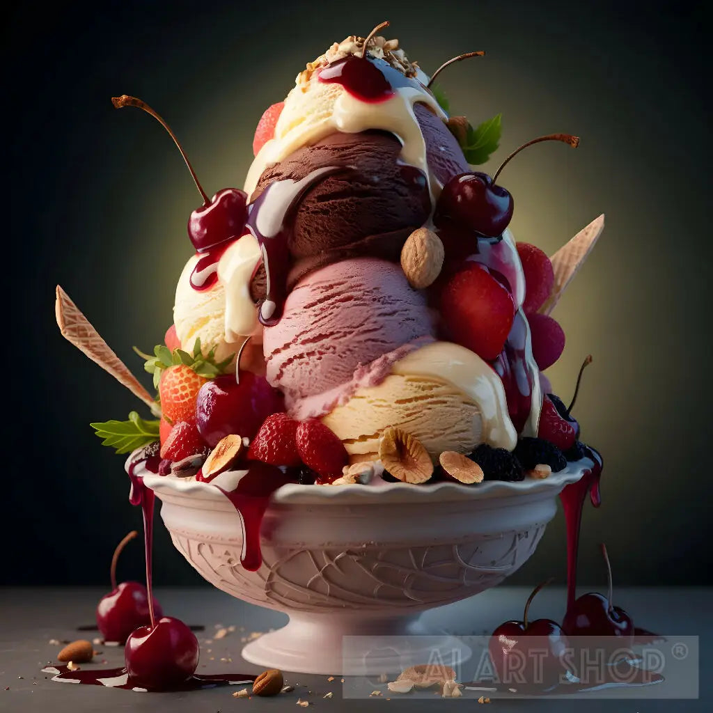 A captivating and whimsical photo of a mouthwatering ice cream sundae, featuring rich layers of chocolate, strawberry, and vanilla ice creams, piled high to create a tantalizing tower of flavor. The sundae is adorned with a vibrant array of fresh fruits, real, plump red cherries dripping with sweet syrups, and a delightful sprinkle of nuts.,
