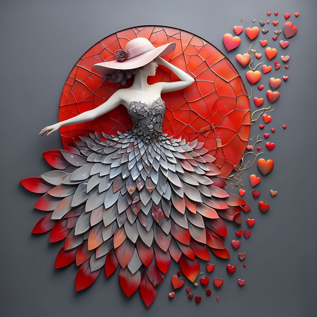 A captivating digital art piece featuring a woman in a flowing, floral gown. The dress is adorned with intricate, 3D petals that create a sense of depth and texture. The woman is standing in front of a large, red circle filled with scattered hearts, symbolizing love and passion. The overall effect is one of elegance, romance, and femininity. This enchanting digital art piece transports the viewer to a world of romance and beauty. A graceful woman stands at the center of the composition, wearing a stunning gown adorned with thousands of delicate, 3D petals. The dress is a masterpiece of intricate design, with each petal carefully crafted to create a sense of depth and texture. Behind the woman, a large, red circle is filled with scattered hearts, symbolizing love and passion. The soft, pastel colors and gentle curves of the artwork create a sense of elegance and femininity.