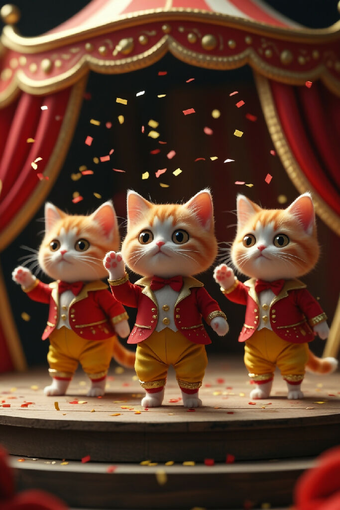 A charming miniature circus stage scene rendered with hyper-realistic details and soft lighting. Three AI-anthropomorphized orange kittens with plump, round faces and expressive eyes are dressed in red circus costumes with yellow pants and tails peeking out from under their clothes. Confetti falls from above the stage as they wave and slip off into the wings. Style: Handcrafted miniature diorama, soft and shallow depth of field, Studio Ghibli aesthetic, warm country atmosphere, 8K resolution