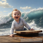 3D image of a baby laughing on a wooden board in the middle of high waves