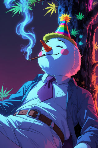 A chilled anime-style snowman, reclining against the trunk of a vibrant, neon-lit cannabis tree. He's dressed in a relaxed, casual outfit, with a loose necktie and a birthday hat tilted over his forehead. He wears a colorful birthday hat, adding a touch of whimsy to his laid-back vibe. His cigar smoke curls up into the air, as he closes his eyes, savoring the moment.