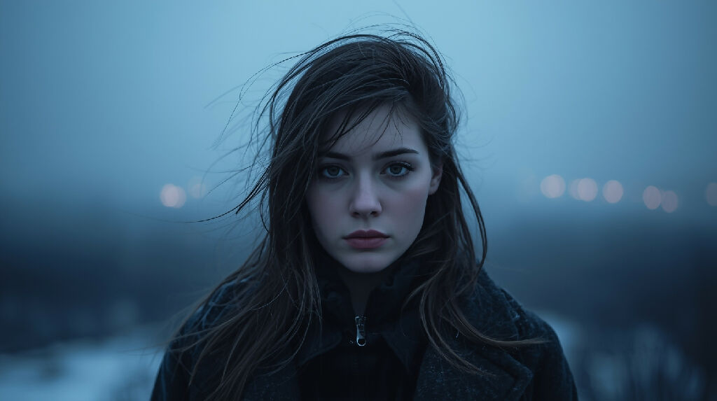 A cinematic HDR ultra-realistic album cover showing a woman standing in front of a misty winter cityscape at dawn. Her hair moves slightly in the cold wind, her eyes are expressive yet calm, symbolizing silent pain. The background is blurred, with soft blue-gray tones and distant lights. Emotional, dramatic lighting, shallow depth of field, 8K detail, photo-realistic, minimalist composition, hit pop album cover aesthetic.