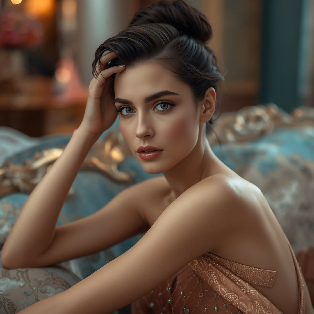 a cinematic photo of a luxurious setting with a feminine touch, featuring lavish decor, soft pastel colors, and opulent fabrics, with a beautiful brunette woman as the central figure, green eyes, with bun, posing elegantly with refined facial features, smooth skin, and stylish hair, surrounded by intricate details and subtle lighting, captured in a high-end photography style with a shallow depth of field, emphasizing the subject's sophistication and glamour, with a mix of warm and cool tones, and a balanced composition that exudes luxury and refinement.