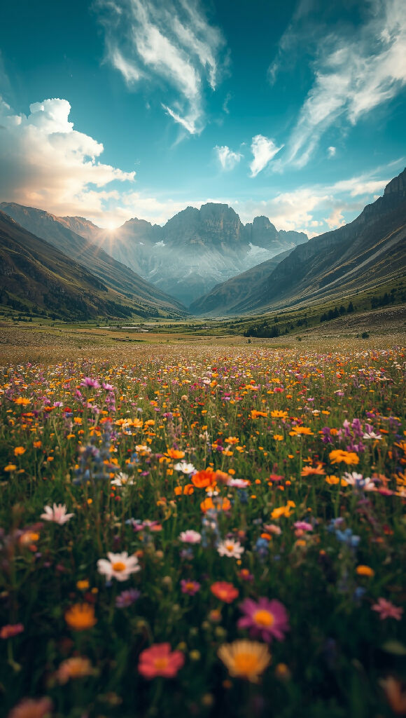 A cinematic photo of a vibrant valley filled with colorful wildflowers swaying gently in the breeze