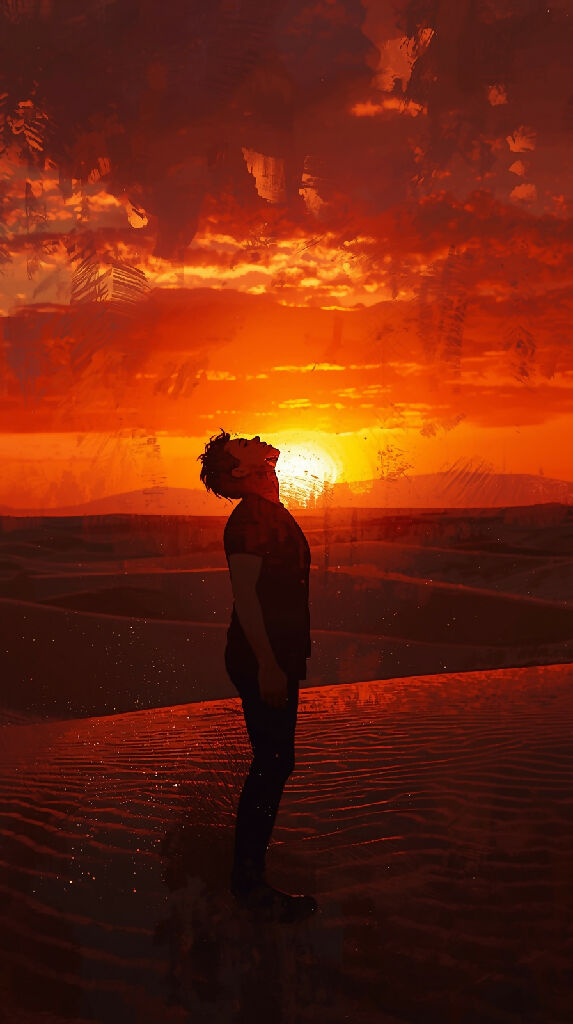 a cinematic photo of the silhouette of a person with defined facial features and medium-toned skin standing back up after falling in the vast desert landscape at sunset, set against a vibrant orange-red sky with warm golden hues, the atmosphere is full of determination and hope, in a dramatic digital art style with bold brushstrokes and intricate textures, captured through a photography lens with a shallow depth of field, emphasizing the subject's resilience and courage.
