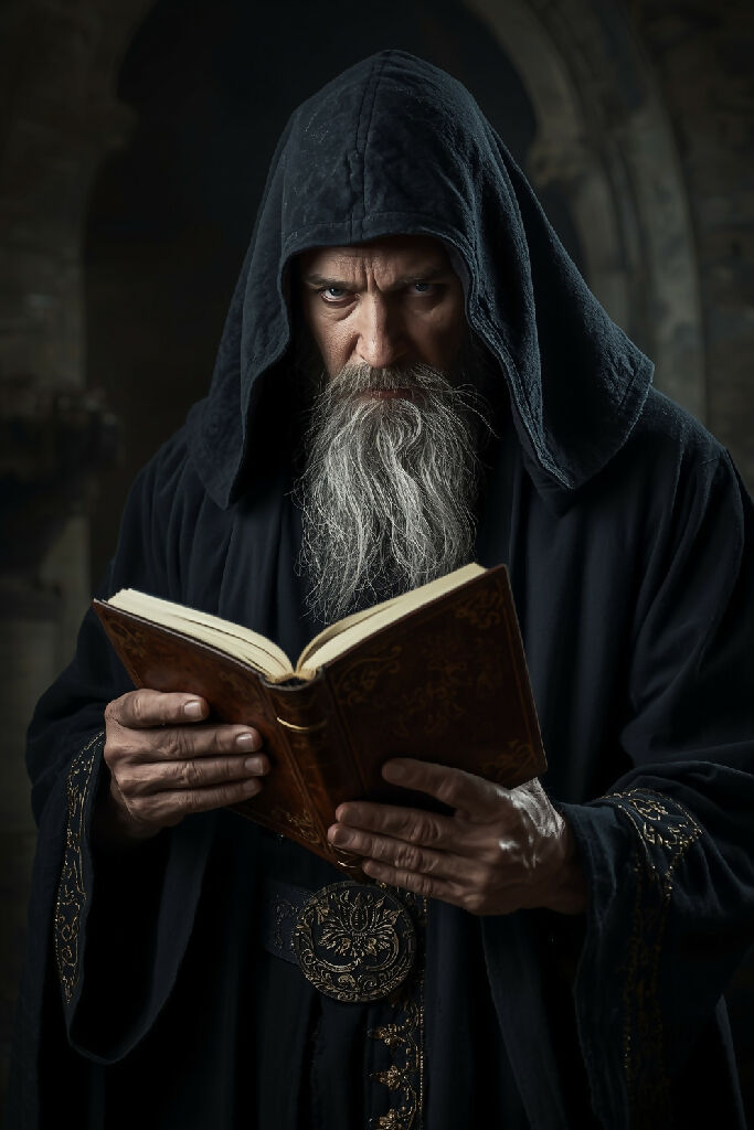 a cinematic photograph of a mysterious sorcerer with an aged leather-bound book in hand, intensely reading a fortune, set against a dark ominous background that exudes bad horror elements, with dramatic lighting and shadows, the sorcerer's facial features are defined by a strong jawline, piercing eyes, and a long white beard, wearing a long black robe with intricate golden embroidery, the overall mood is foreboding and ominous, with a sense of impending doom, the photography style is gritty and high contrast, with deep blacks and muted colors, capturing the intensity of the moment.