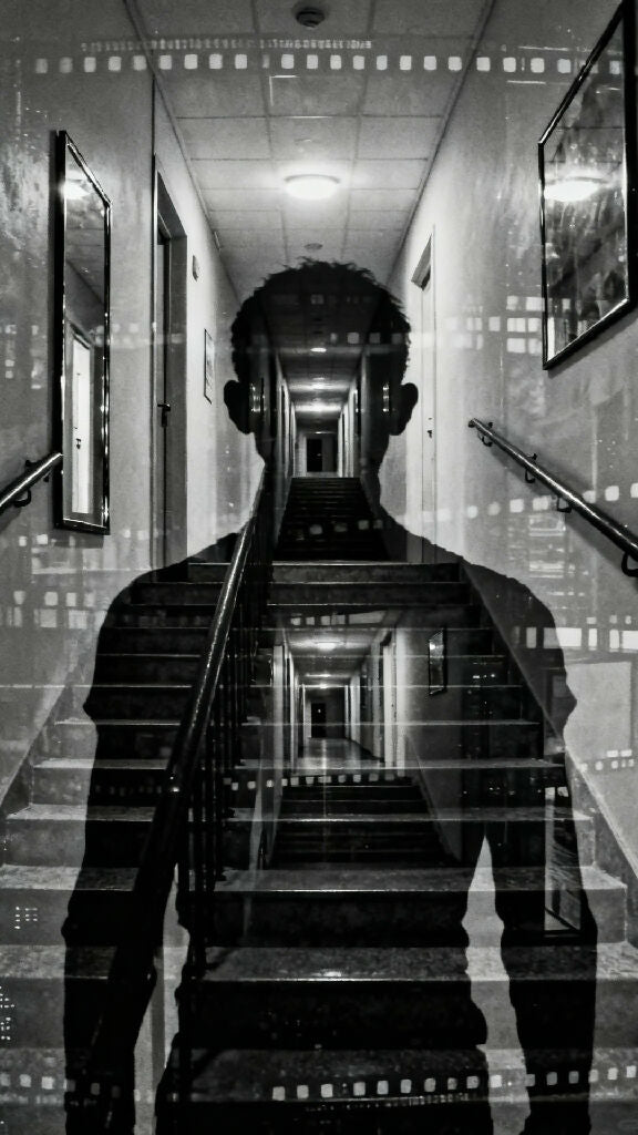 A cinematic visual interpretation of the journalist’s theory: overlapping images of hallways, staircases, mirrors, and places photographed thousands of times. In the center, a shadowy figure forms from layered memories rather than flesh. Its outline is built from repeated frames, frozen moments, and photographic echoes. The composition feels scientific yet terrifying. Techno-horror meets analog-memory aesthetic.