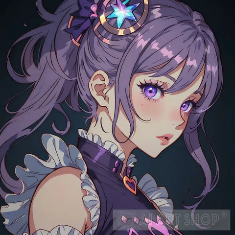 Her eyes, the focal point of the illustration, gleam with a luminous purple hue, reminiscent of twilight skies or the petals of an exotic flower. They are large and expressive, framed by thick, fluttering lashes that accentuate their ethereal beauty. Within their depths, there is a hint of mystery and depth, as if they hold secrets waiting to be unveiled.