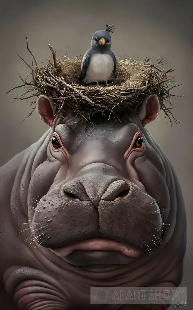 A close-up of a hippopotamus's face. Atop the hippo's head is a nest made of twigs and straw, with a small bird perched on its edge. The bird appears to be gray with a white underbelly and a distinctive beak. The hippo's eyes are large, with a reflectiv