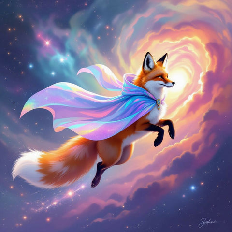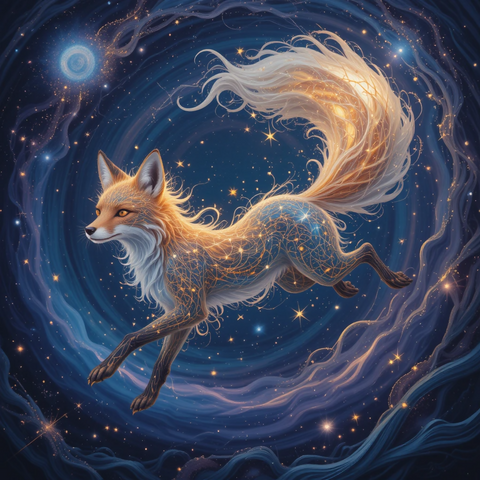 A cosmic fox with a tail made of stars leaping through a swirling galaxy