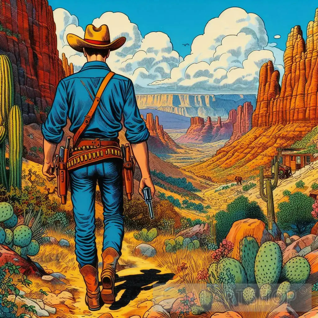 detailed, vibrant illustration of a cowboy in the copper canyons the sierra of Chihuahua state, by Herge, in the style of Tin-Tin comics, vibrant colors, detailed, sunny day, attention to detail, 8k.