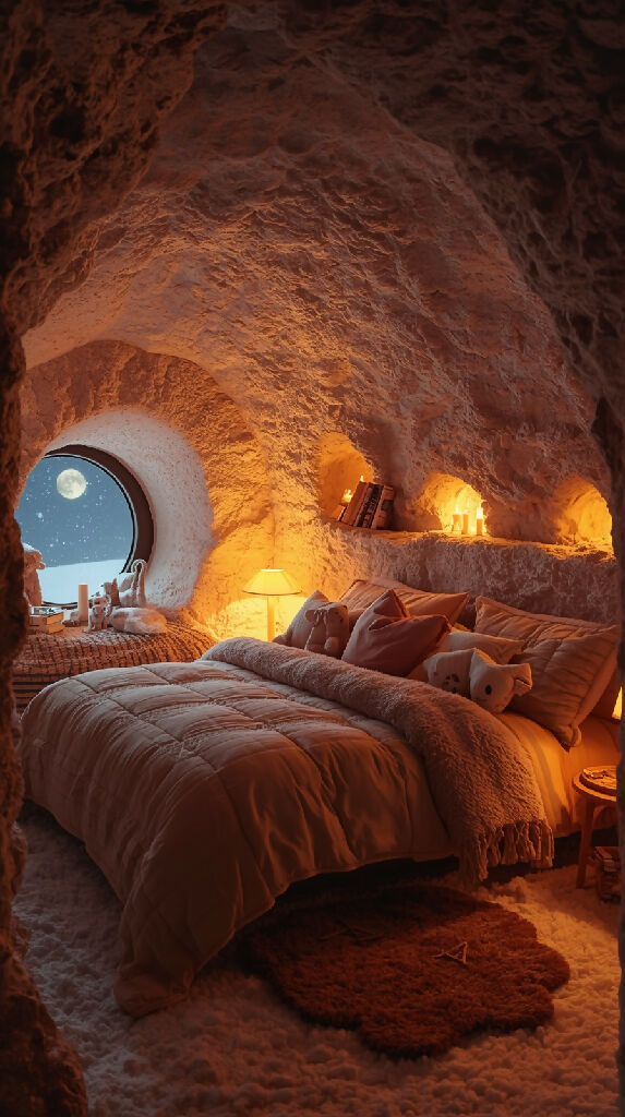 A cozy cave-style bedroom built into a snowy hillside, with soft rounded clay-textured walls glowing warmly under dim lights. A large low-level bed fills the room, covered with beige and pink bedding, many plush toys, and fluffy pillows. Outside the small curved window, gentle snowfall sparkles under the moonlight. A soft yellow floor lamp glows beside the bed, with books and candles on a wooden shelf. Peaceful snow night mood, ultra-realistic, cinematic lighting, cozy aesthetic.