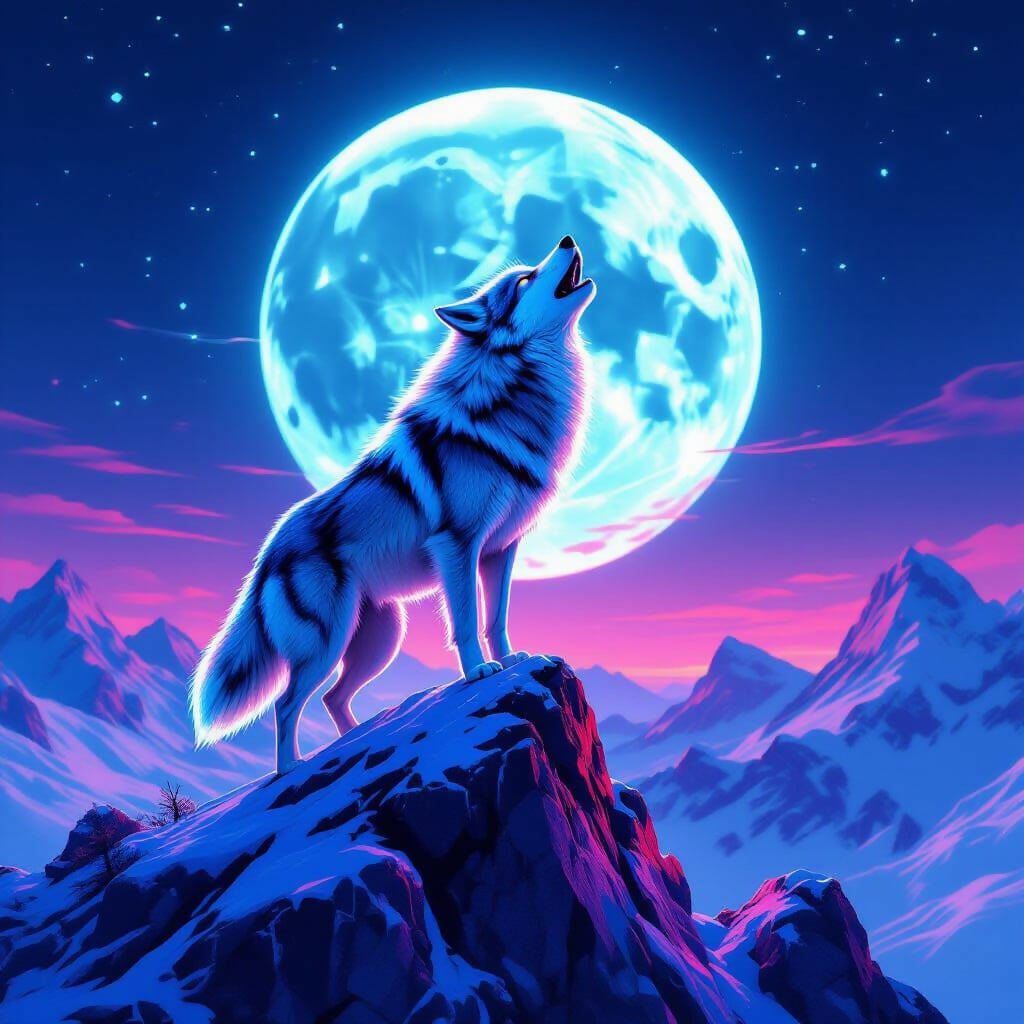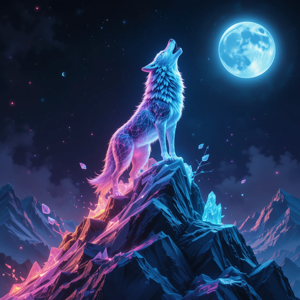 A crystal wolf howling on a peak made of neon ice under a glitching moon