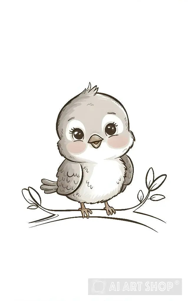 A delightful illustration of an adorable tiny bird perched on a simple branch. The bird is drawn in a cute cartoon style with bright eyes and a small, innocent beak. It is surrounded by a clean, white background, emphasizing the cuteness of the bird. The overall feeling of the image is light-hearted and whimsical, perfect for bringing a smile to anyone who views it.