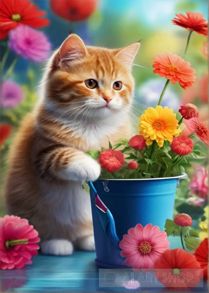 Design a bright image with artificial intelligence of a cute little cat playing in the garden with wonderful flowers in a variety of bright colors, high quality, distinct colors