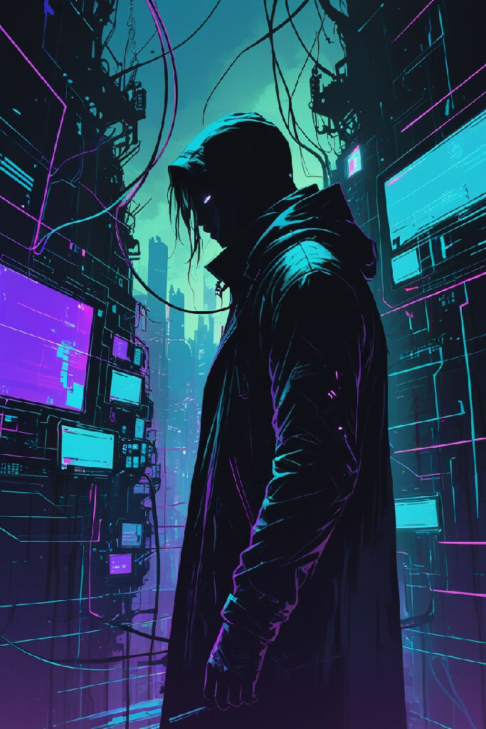 a dark and moody digital illustration with a futuristic, cyberpunk vibe, featuring a lone figure in the shadows, surrounded by distorted, glitching screens and tangled neon wires, with a cityscape in the background, bathed in a mesmerizing blend of deep blues, purples, and greens, evoking the ominous, high-energy atmosphere of a phonk music track, with bold, angular lines and abstract shapes, reminiscent of a futuristic, dystopian world, and subtle hints of industrial textures, conveying a sense of dissonance and unease.