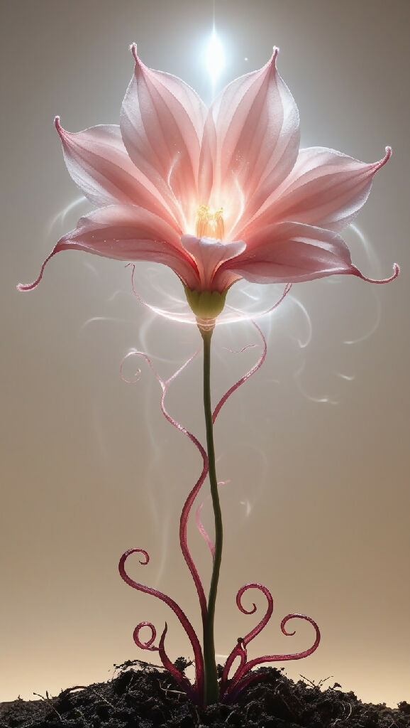 A delicate, exquisite flower with petals shaped like tender fingers, blooming in a subtle, shimmering light, embodies the concept of Desire, its center forming a soft, inviting vortex that draws the viewer in, the stem strong and slender, rising from a bed of dark, rich soil, surrounded by intricate, curved tendrils that evoke a sense of longing, the flower's colors a gradient of blush pink to deep crimson, evoking passion and fervor, set against a soft, creamy background that seems to glow with an inner light, the overall atmosphere one of quiet, intense yearning.
