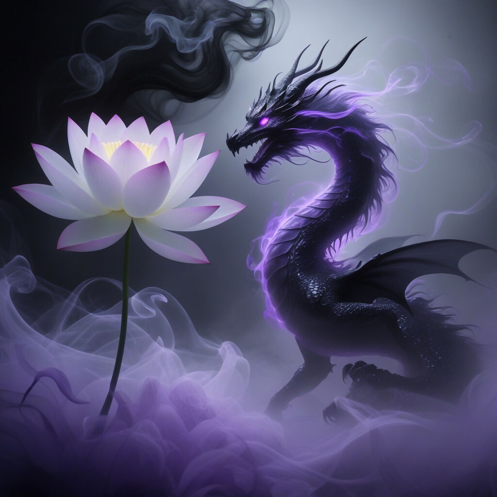 A delicate, translucent purple glow emanates from the tender petals of a serene lotus flower, set against a mystical background of swirling black, white, and purple mist that evokes an otherworldly atmosphere. Emerging from the ethereal fog, a ghostly, misty black dragon takes shape, its body a mesmerizing blend of dark, smoky tendrils and shimmering, iridescent scales that seem to shift and undulate in the soft, luminescent light. The dragon's eyes burn with an intense, glowing purple fire, casting an hypnotic gaze that draws the viewer in. The overall effect is one of haunting beauty and mystical wonder, as if the viewer has stumbled upon a hidden, dreamlike realm where magic and mystery reign.